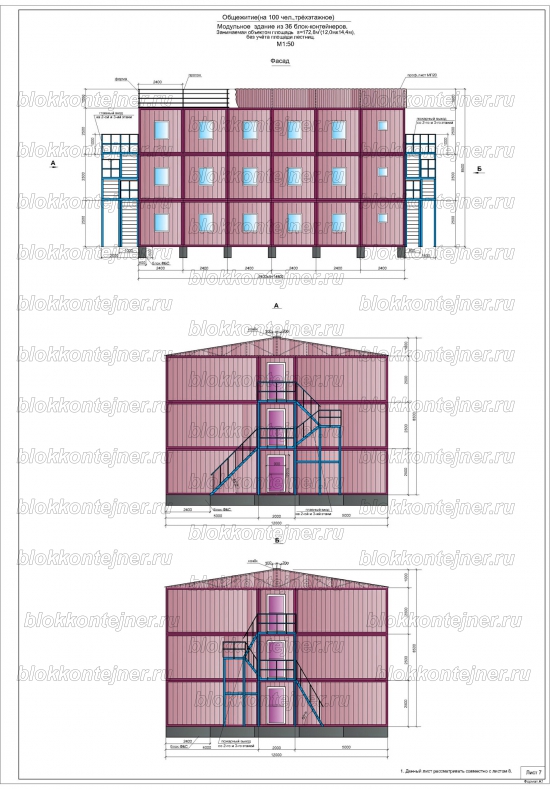 Общежитие на 150 человек, трехэтажное из 36 БК